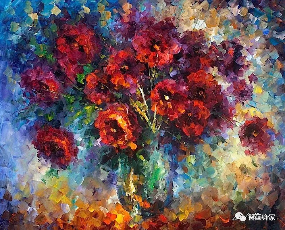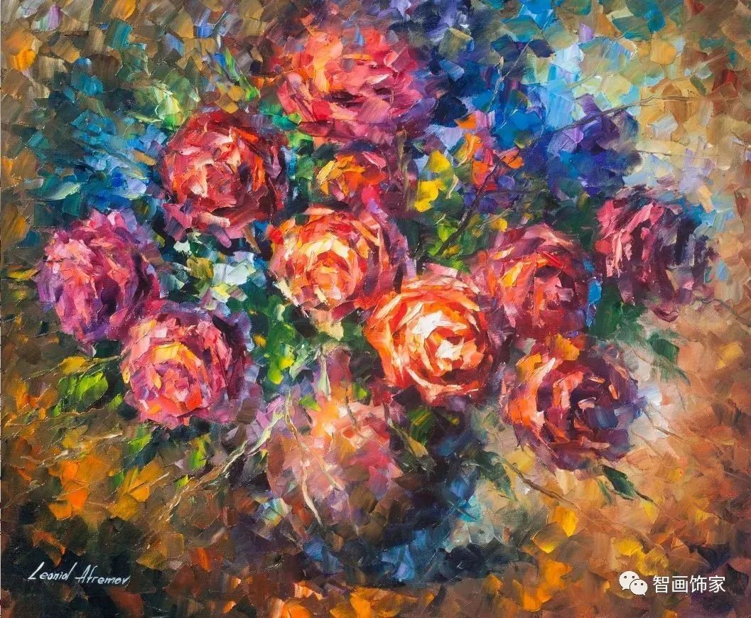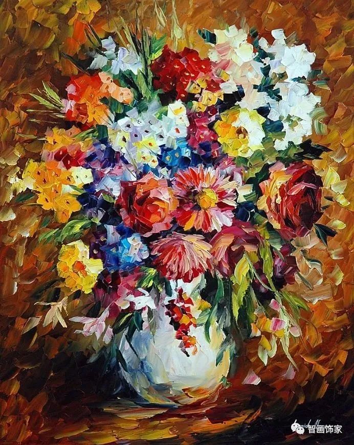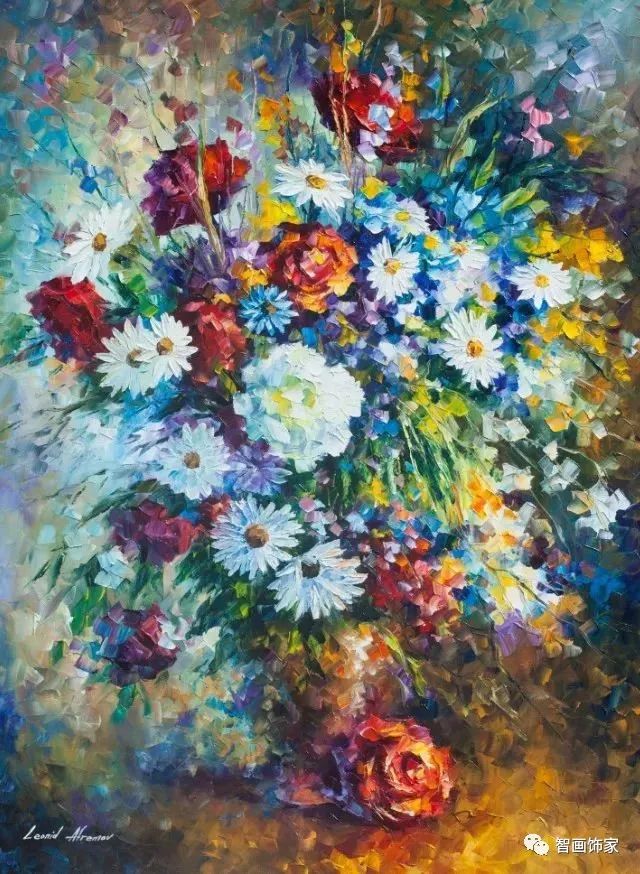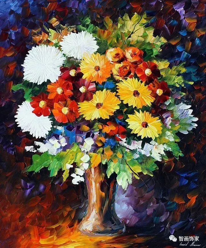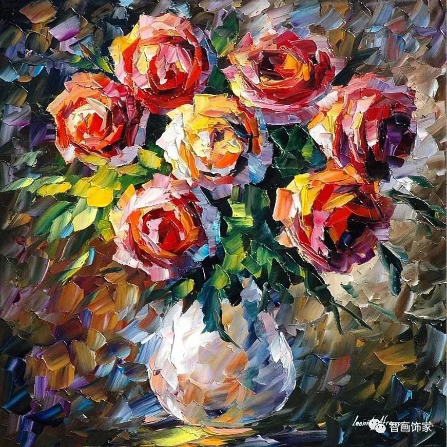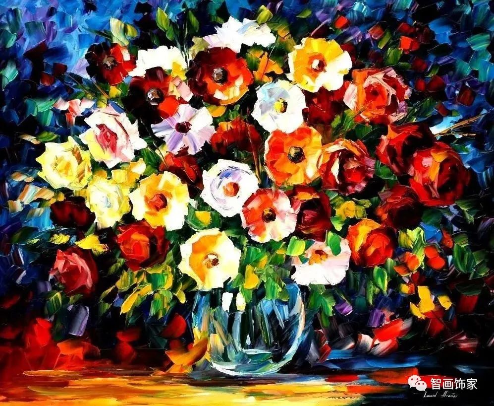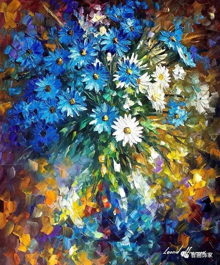 Leonid Afremov, 出生于白俄罗斯维捷布斯克市,是当代著名的现代印象派艺术家。其作品主要用调色刀与天然油料的搭配在画布上作画。以刀作画,他的绘画技巧、色彩上的层次运用纯熟浑厚, 令人惊叹。见过他不少风景,今天带来的是他笔下的静物花卉,看它们是如何绽放的。