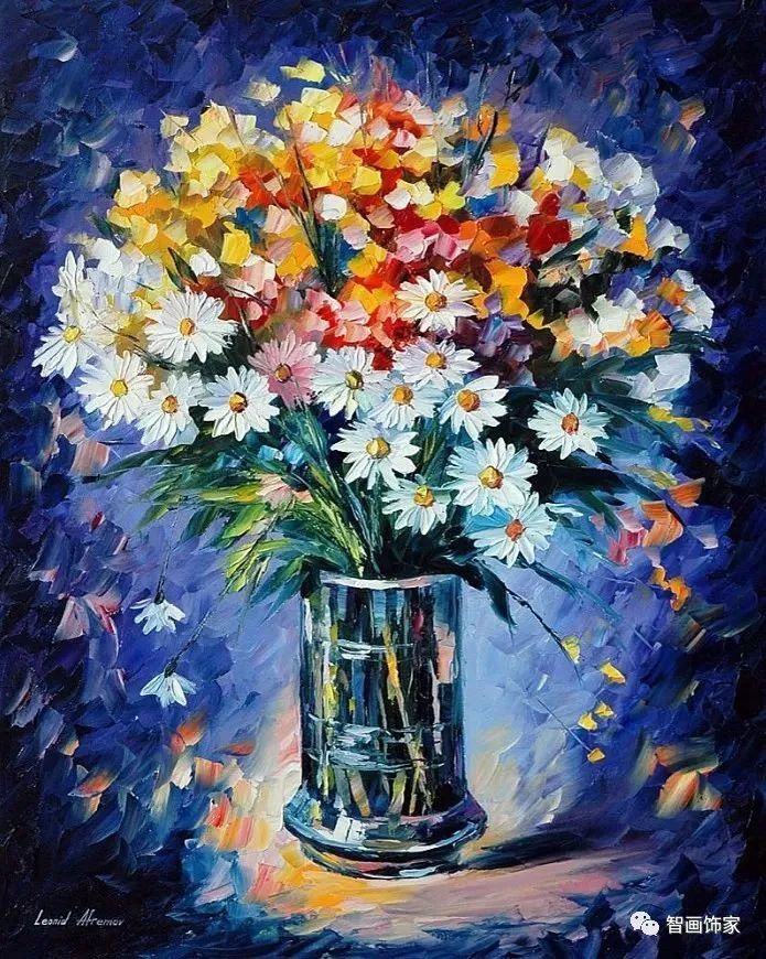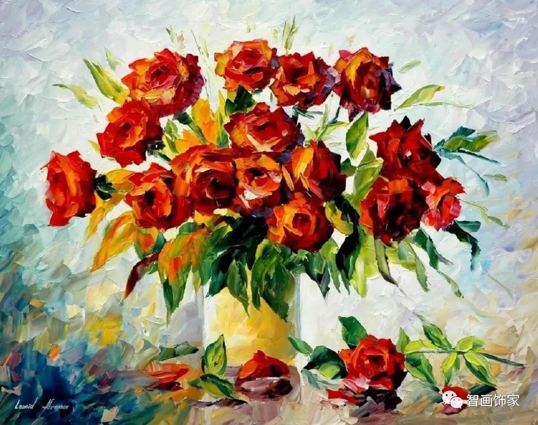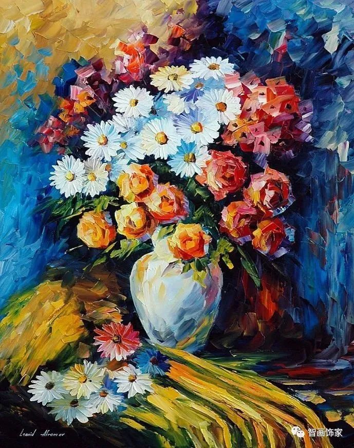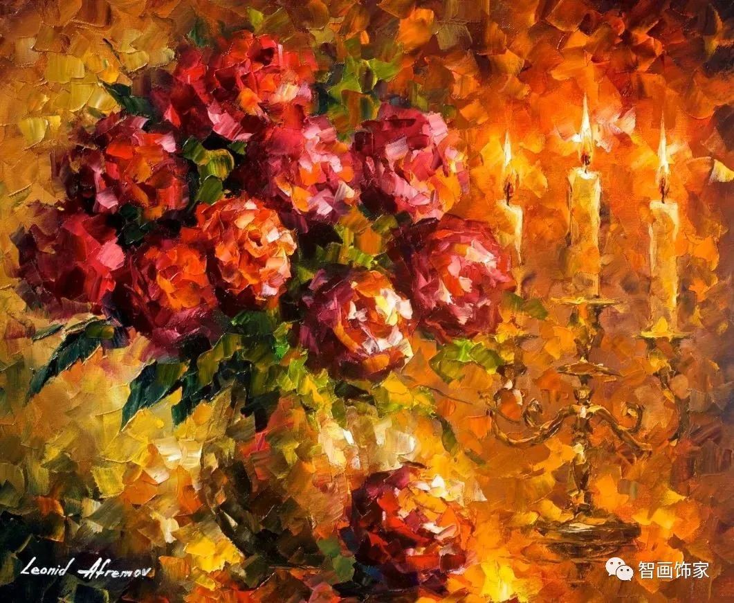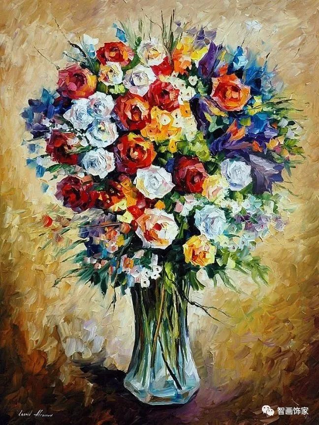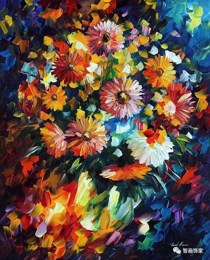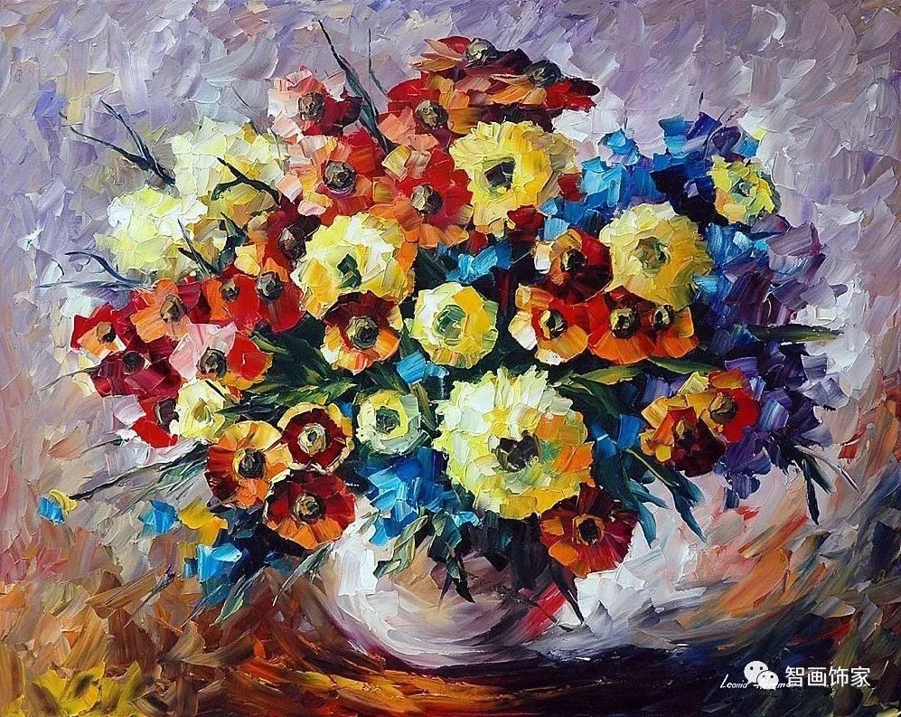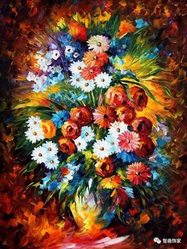 Leonid Afremov, 出生于白俄罗斯维捷布斯克市,是当代著名的现代印象派艺术家。其作品主要用调色刀与天然油料的搭配在画布上作画。以刀作画,他的绘画技巧、色彩上的层次运用纯熟浑厚, 令人惊叹。见过他不少风景,今天带来的是他笔下的静物花卉,看它们是如何绽放的。