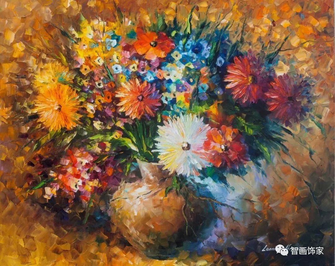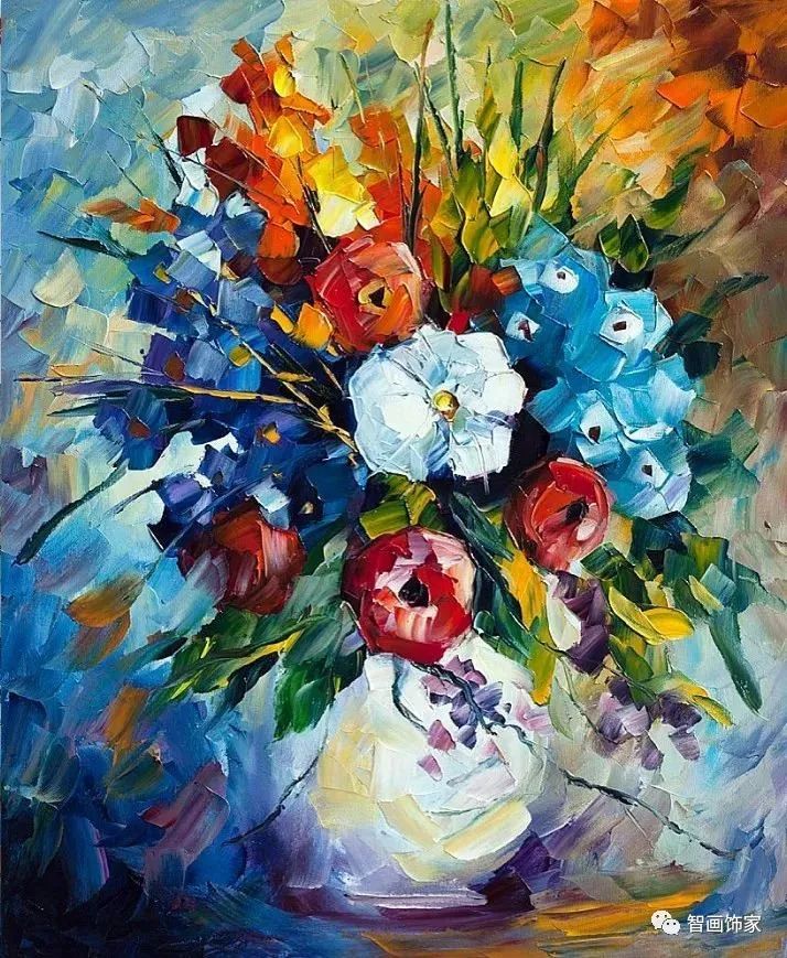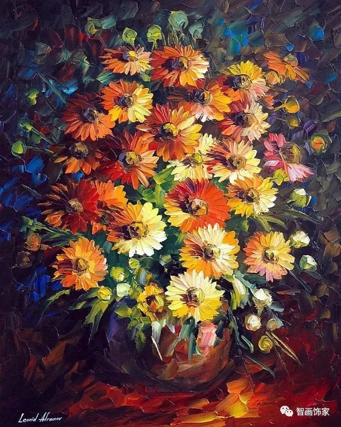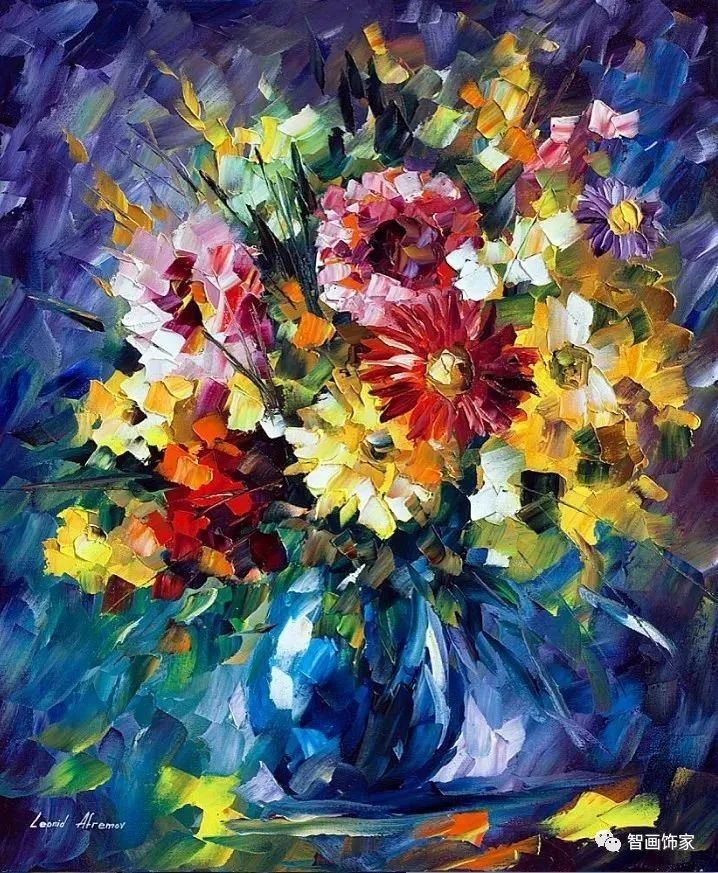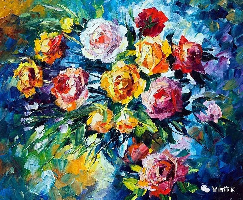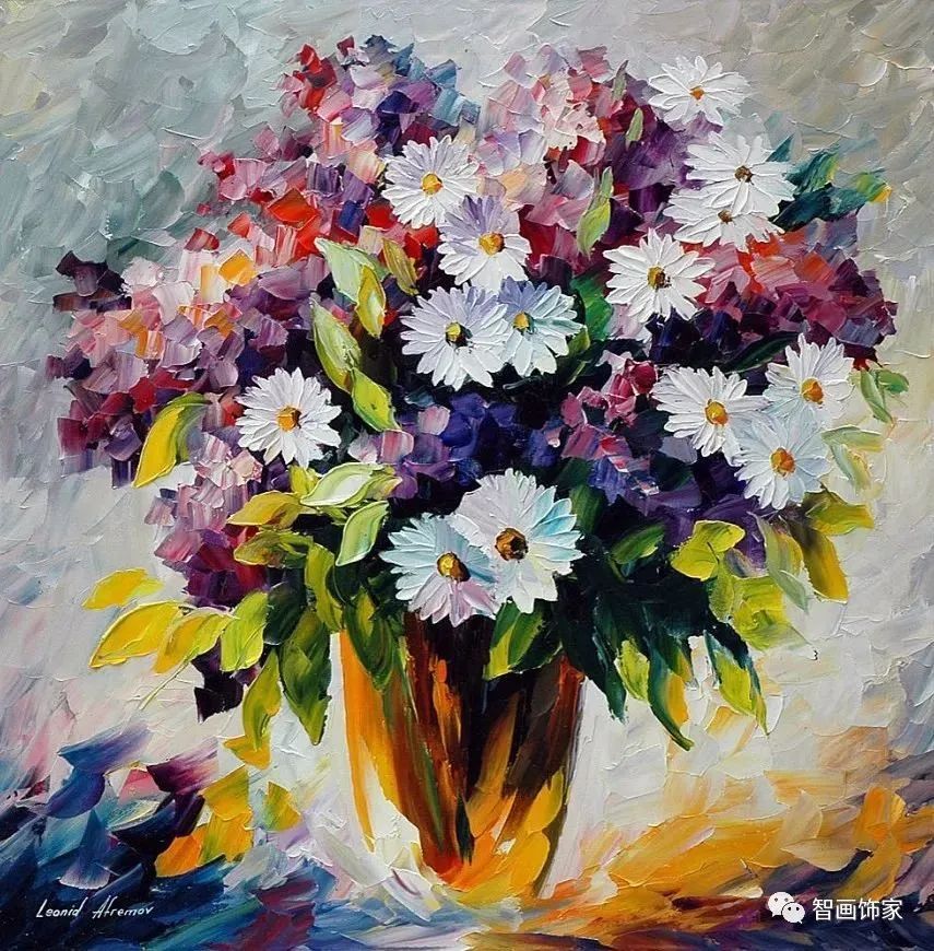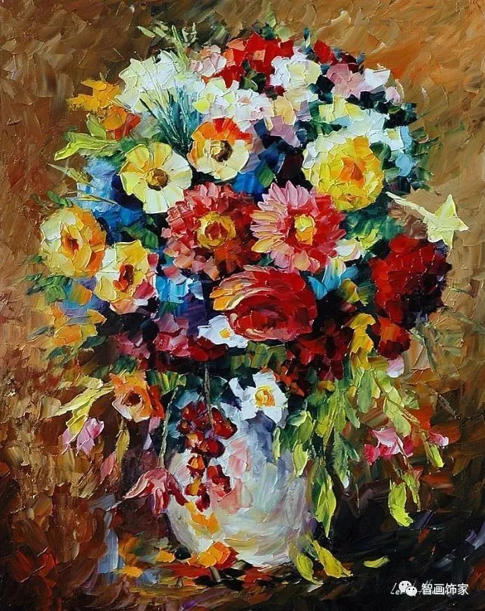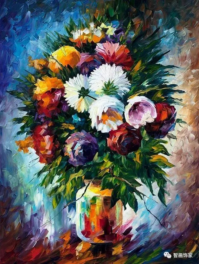 Leonid Afremov, 出生于白俄罗斯维捷布斯克市,是当代著名的现代印象派艺术家。其作品主要用调色刀与天然油料的搭配在画布上作画。以刀作画,他的绘画技巧、色彩上的层次运用纯熟浑厚, 令人惊叹。见过他不少风景,今天带来的是他笔下的静物花卉,看它们是如何绽放的。