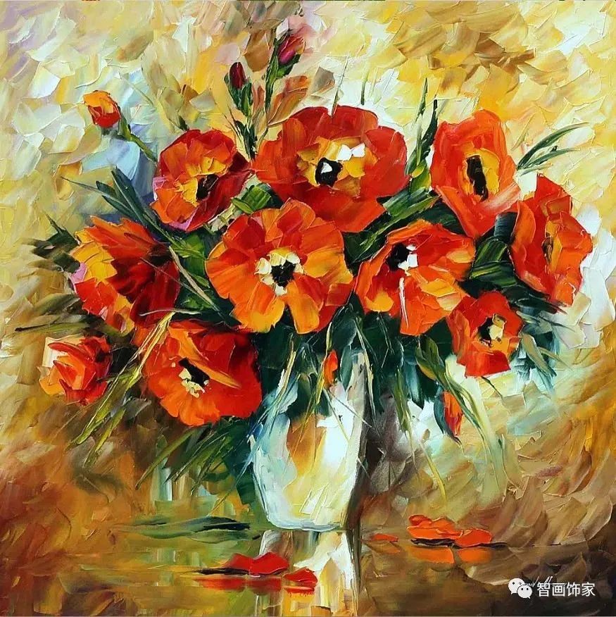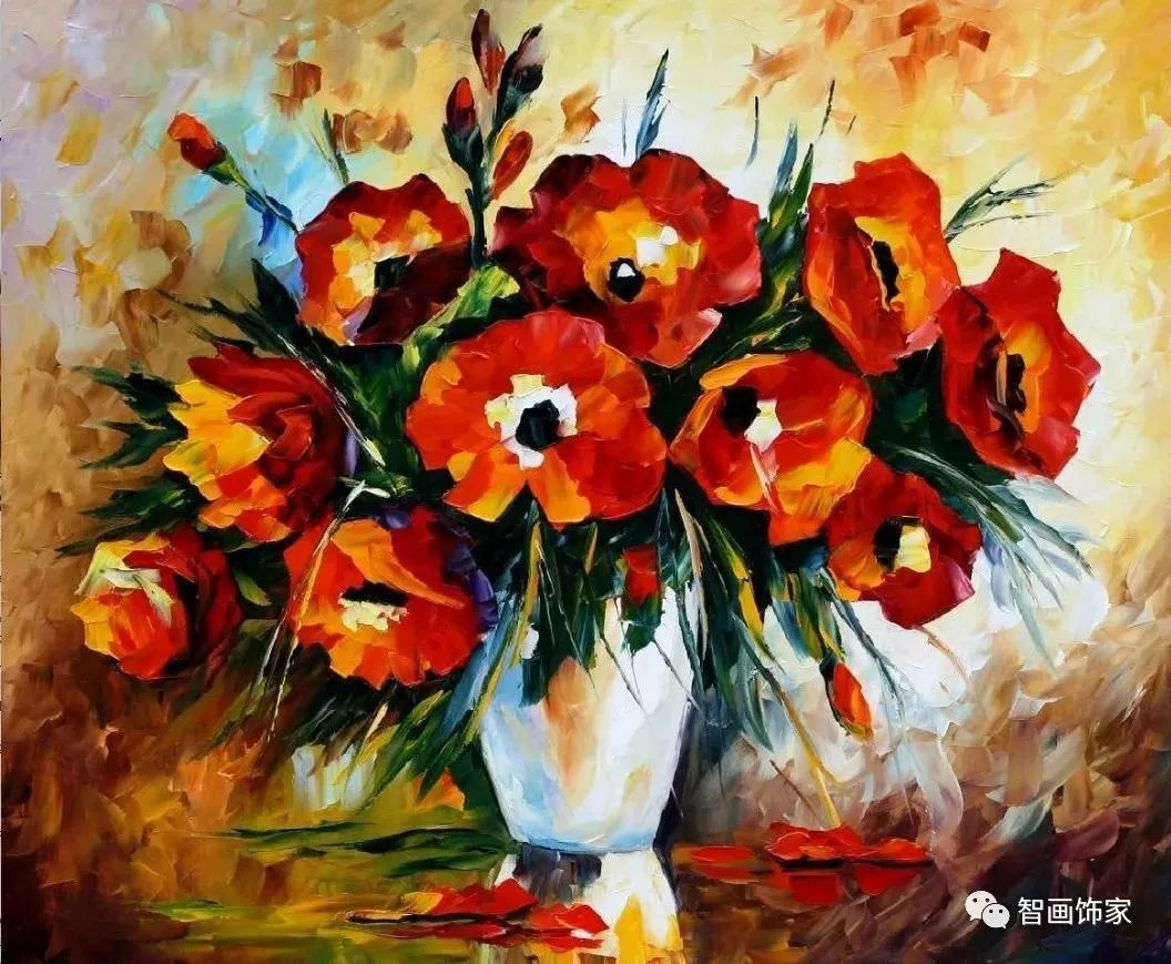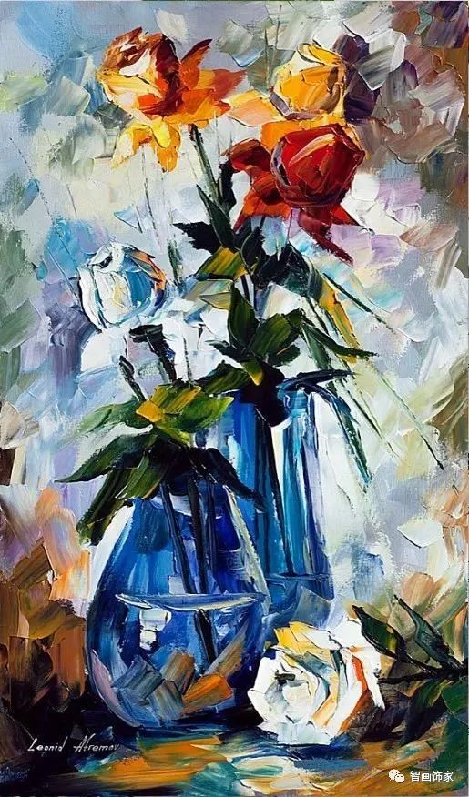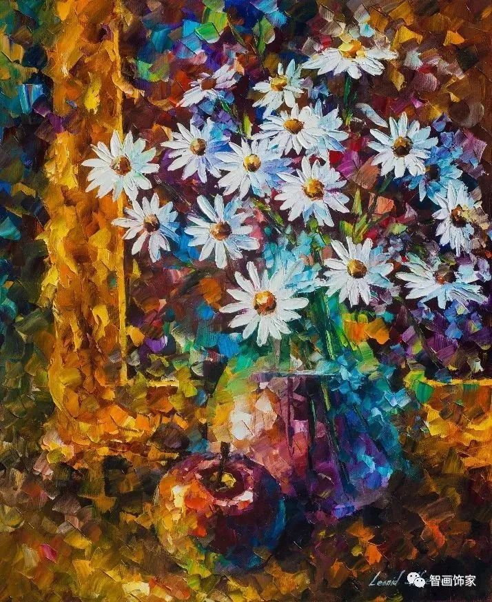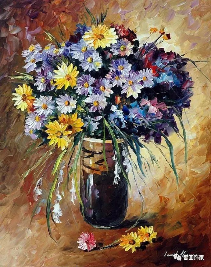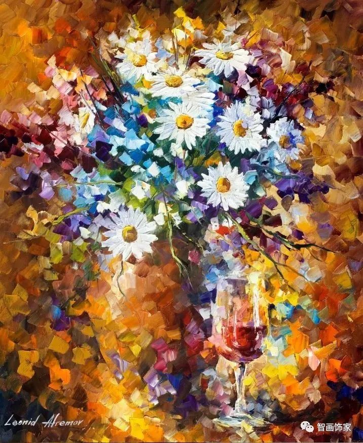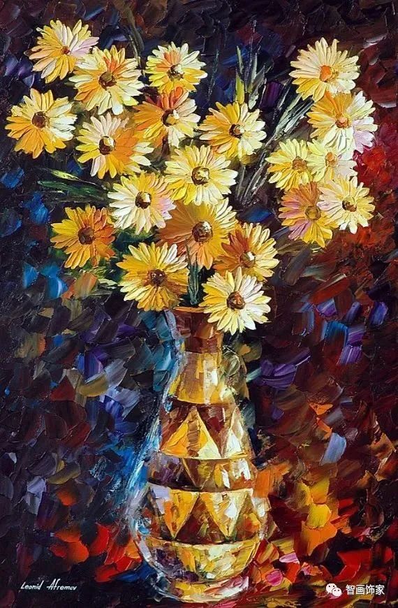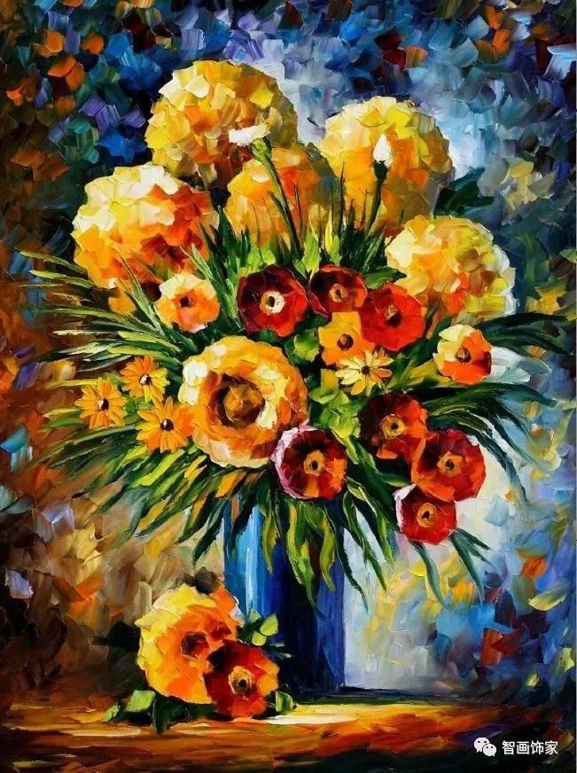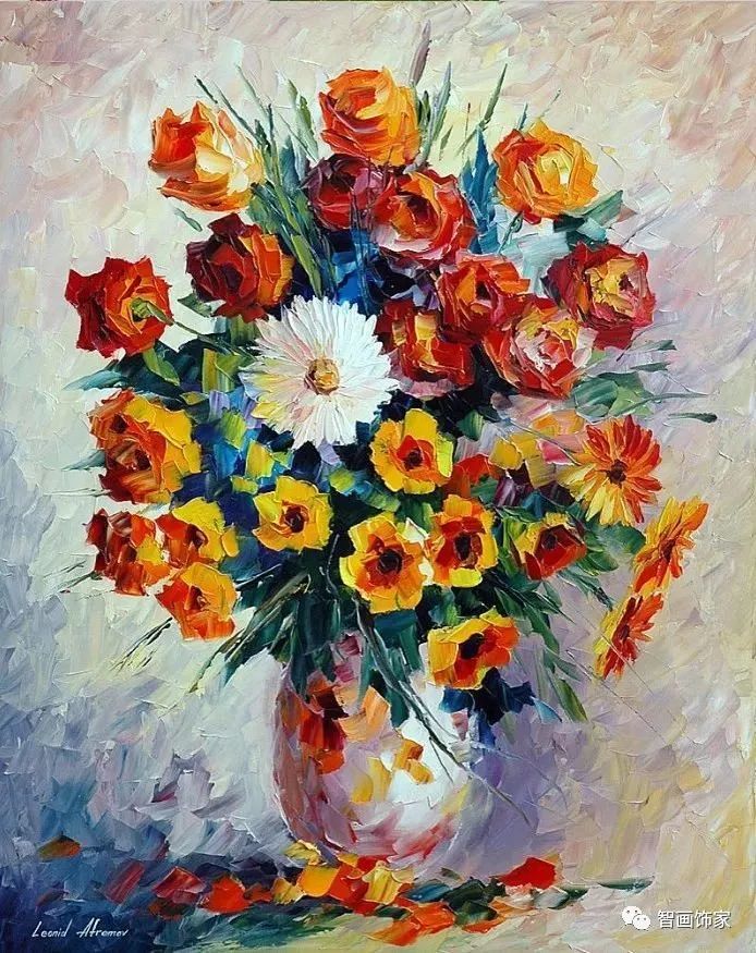 Leonid Afremov, 出生于白俄罗斯维捷布斯克市,是当代著名的现代印象派艺术家。其作品主要用调色刀与天然油料的搭配在画布上作画。以刀作画,他的绘画技巧、色彩上的层次运用纯熟浑厚, 令人惊叹。见过他不少风景,今天带来的是他笔下的静物花卉,看它们是如何绽放的。