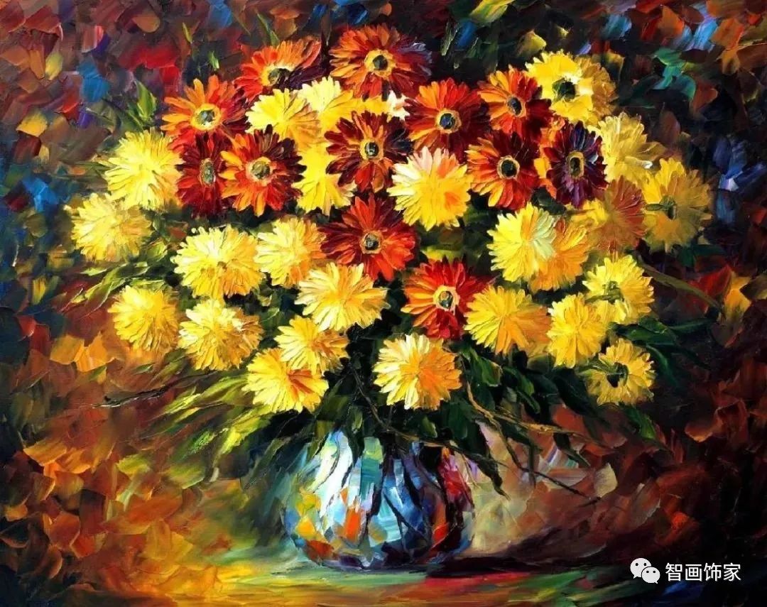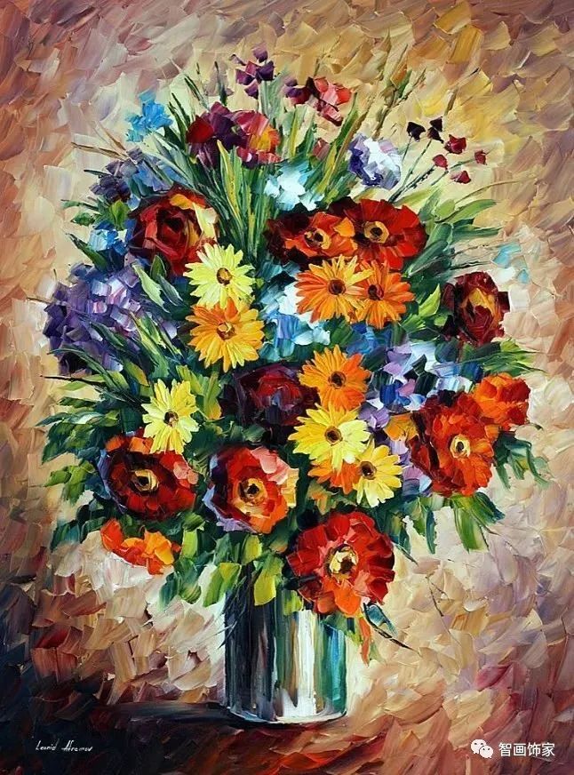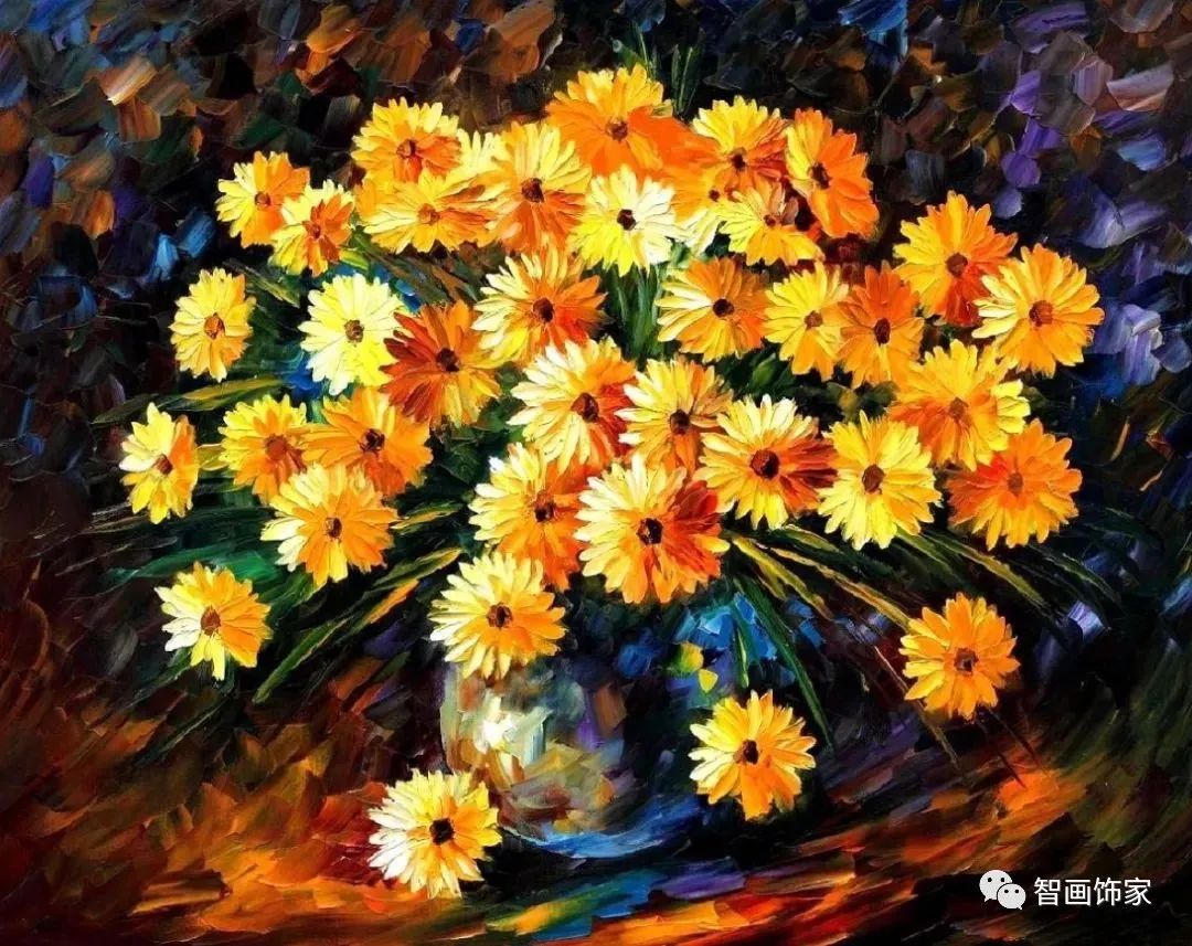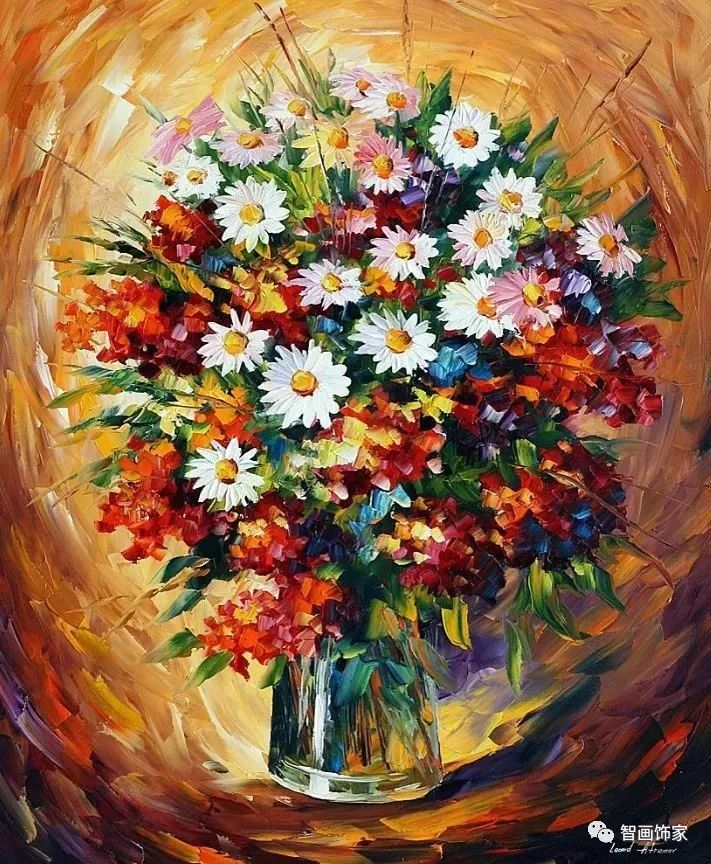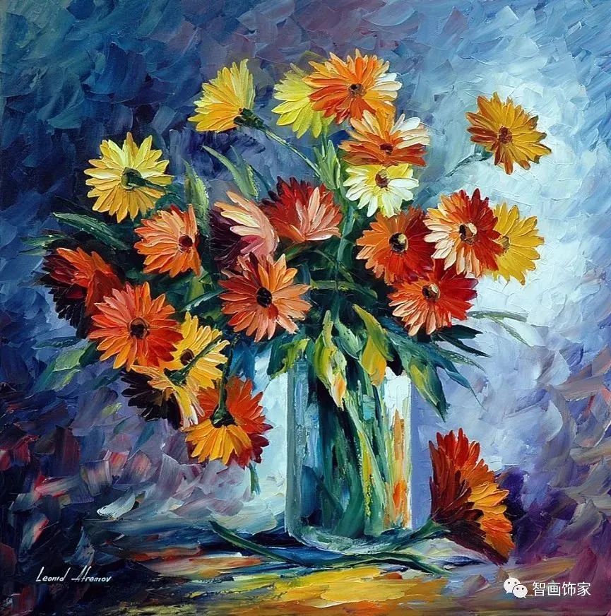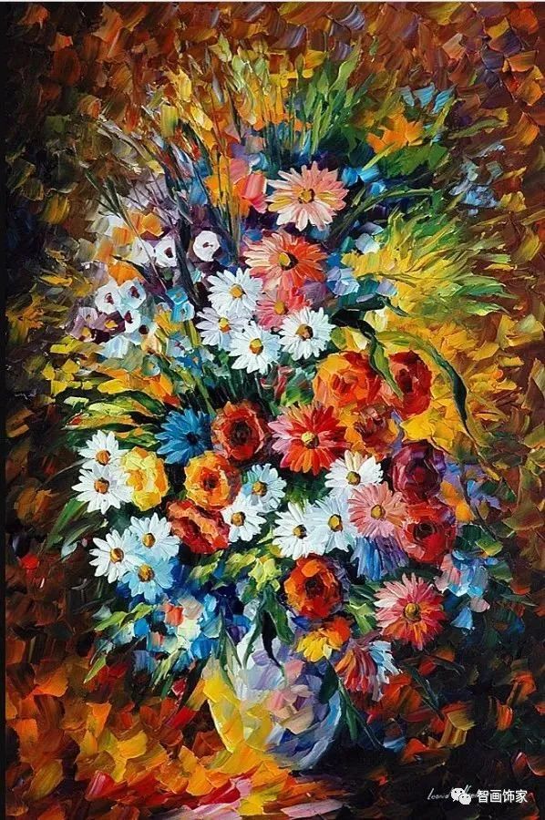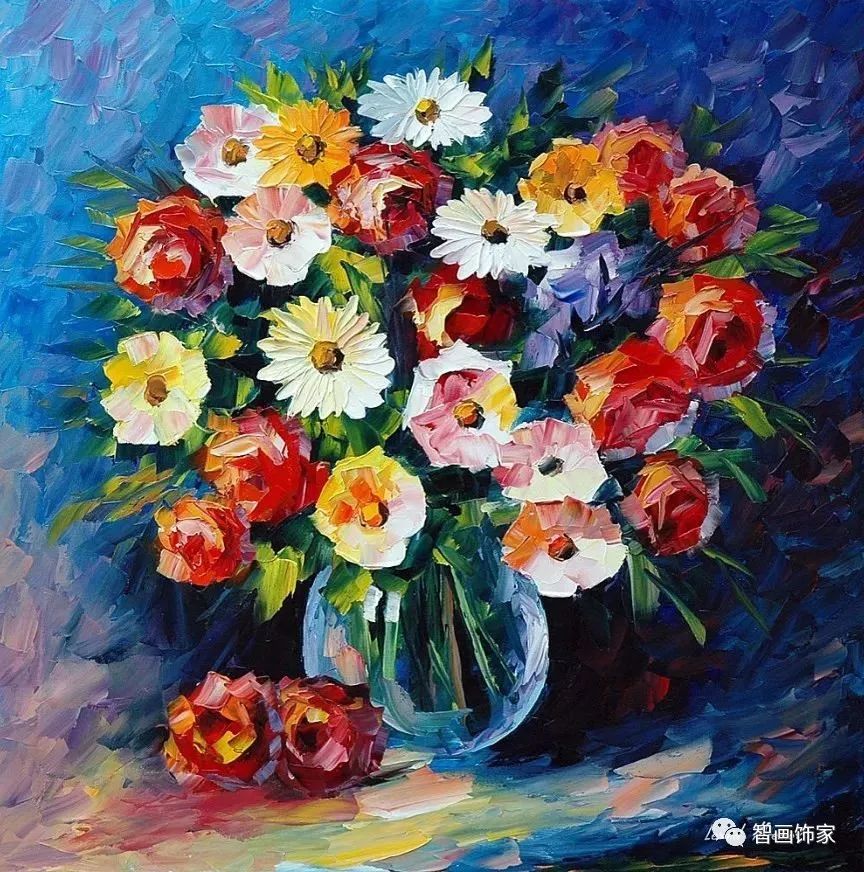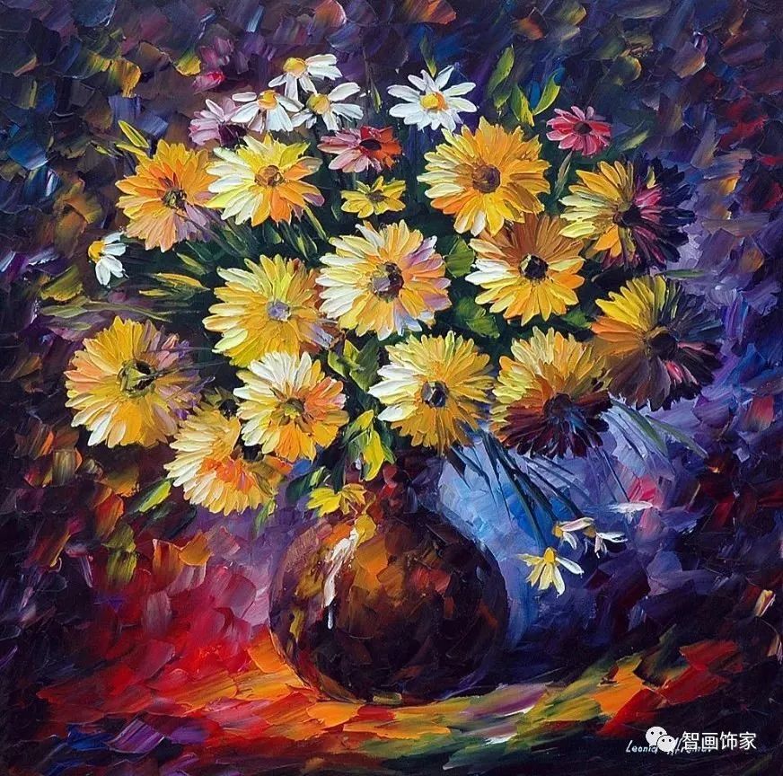 Leonid Afremov, 出生于白俄罗斯维捷布斯克市,是当代著名的现代印象派艺术家。其作品主要用调色刀与天然油料的搭配在画布上作画。以刀作画,他的绘画技巧、色彩上的层次运用纯熟浑厚, 令人惊叹。见过他不少风景,今天带来的是他笔下的静物花卉,看它们是如何绽放的。