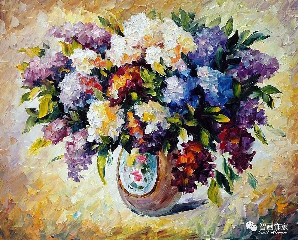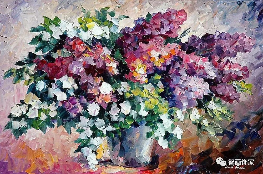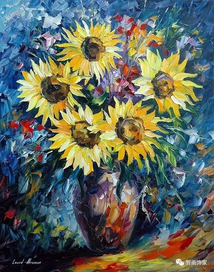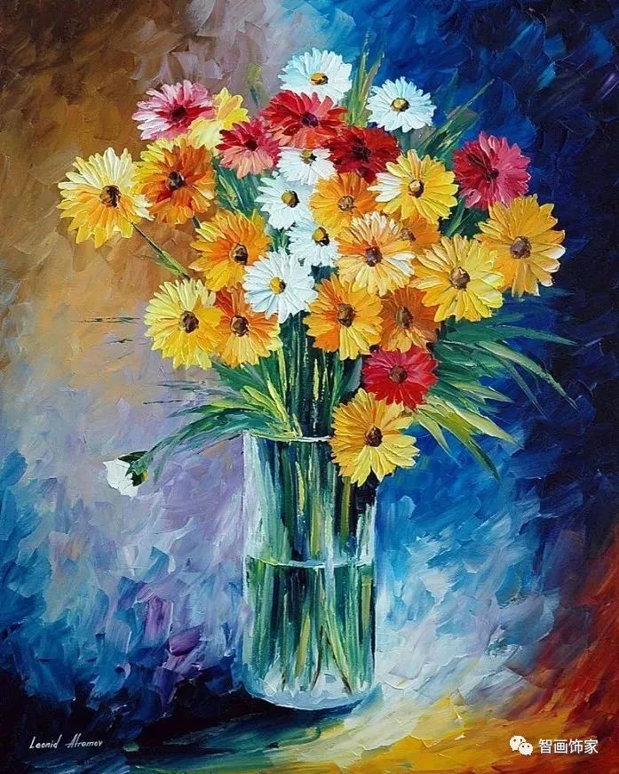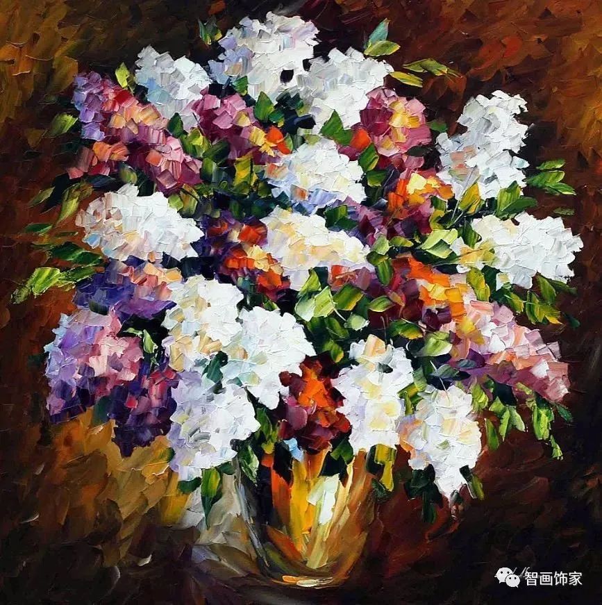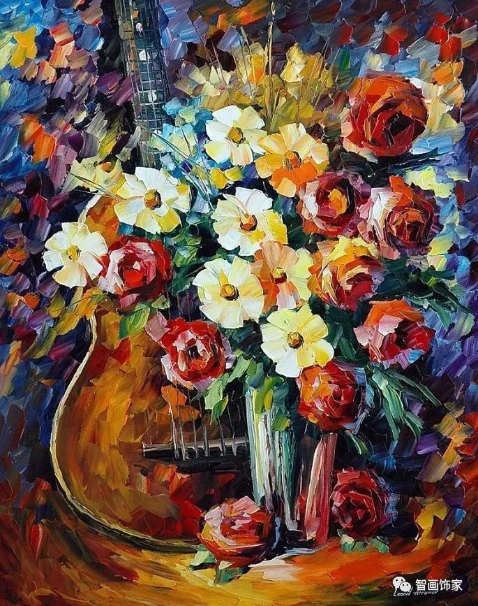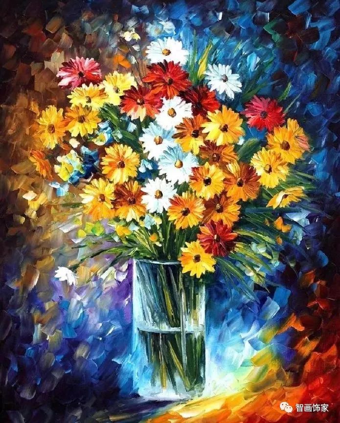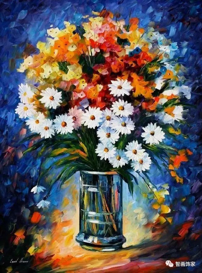 Leonid Afremov, 出生于白俄罗斯维捷布斯克市,是当代著名的现代印象派艺术家。其作品主要用调色刀与天然油料的搭配在画布上作画。以刀作画,他的绘画技巧、色彩上的层次运用纯熟浑厚, 令人惊叹。见过他不少风景,今天带来的是他笔下的静物花卉,看它们是如何绽放的。