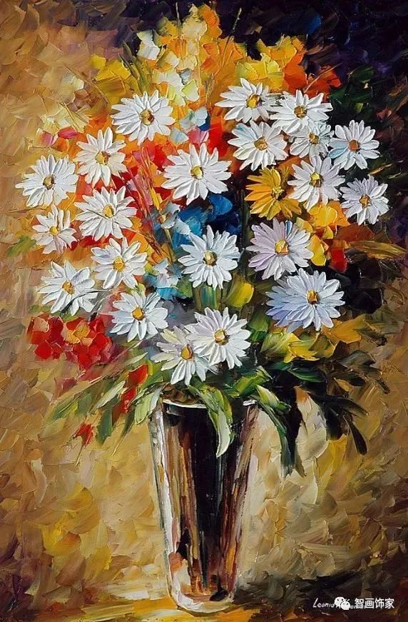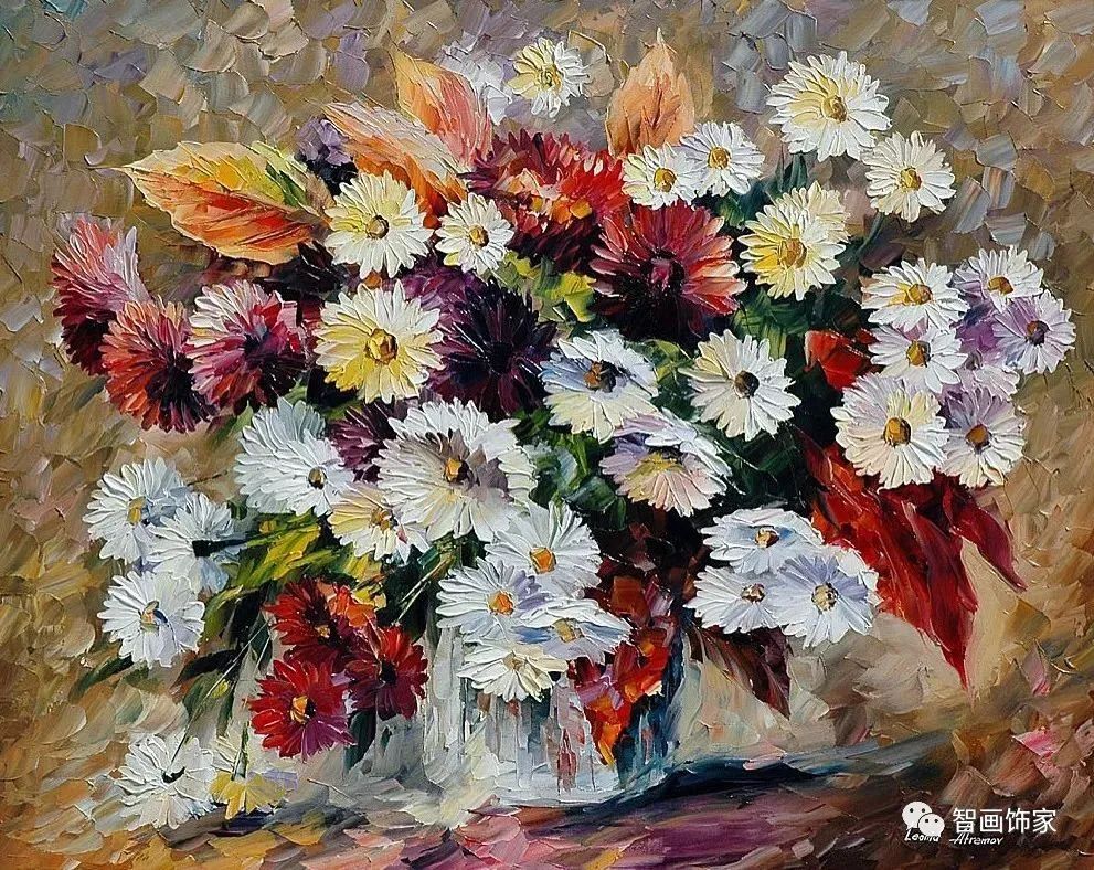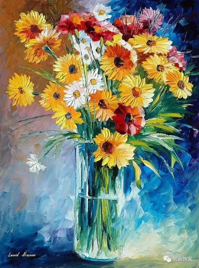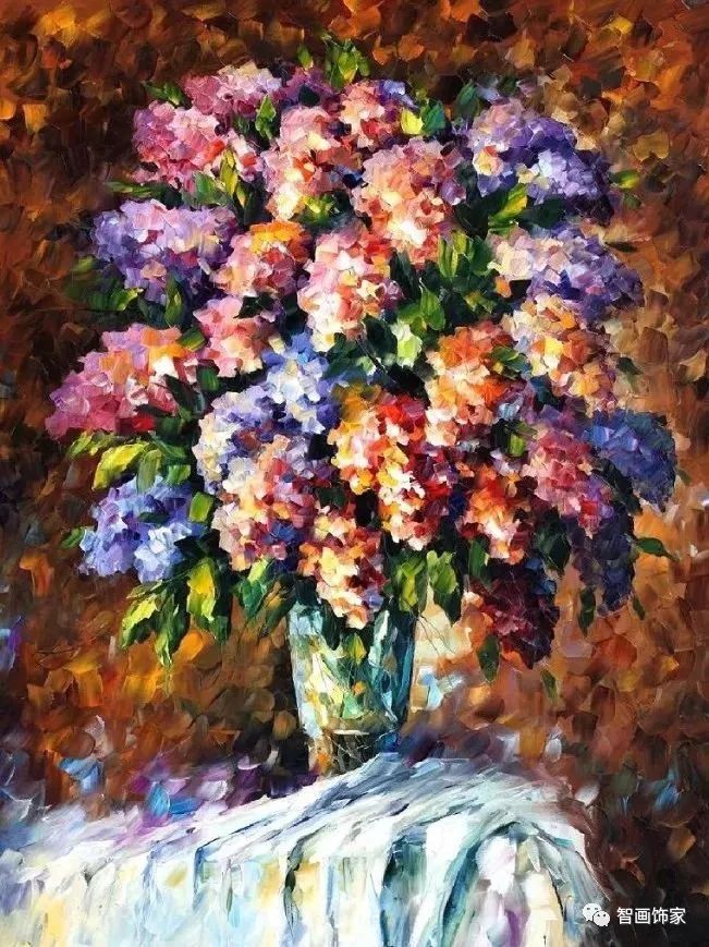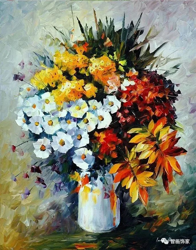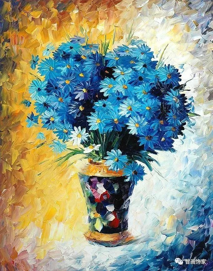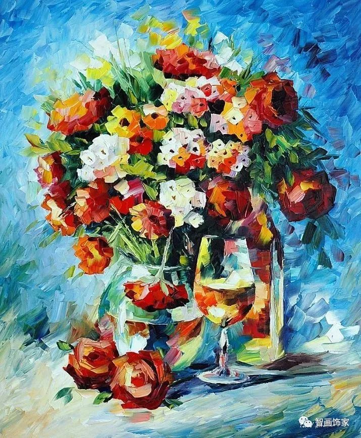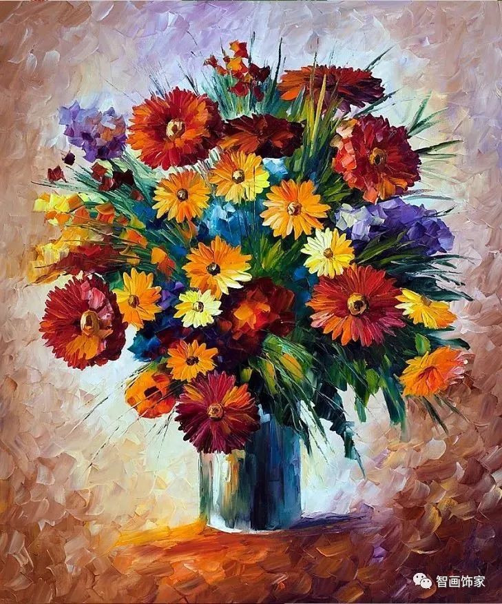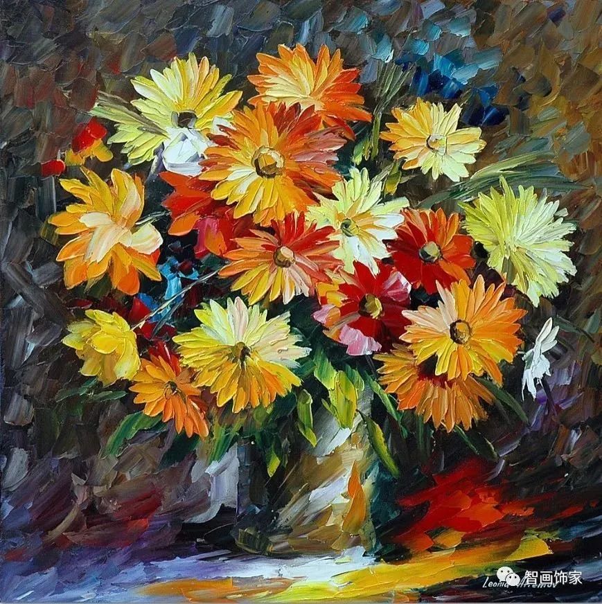 Leonid Afremov, 出生于白俄罗斯维捷布斯克市,是当代著名的现代印象派艺术家。其作品主要用调色刀与天然油料的搭配在画布上作画。以刀作画,他的绘画技巧、色彩上的层次运用纯熟浑厚, 令人惊叹。见过他不少风景,今天带来的是他笔下的静物花卉,看它们是如何绽放的。
