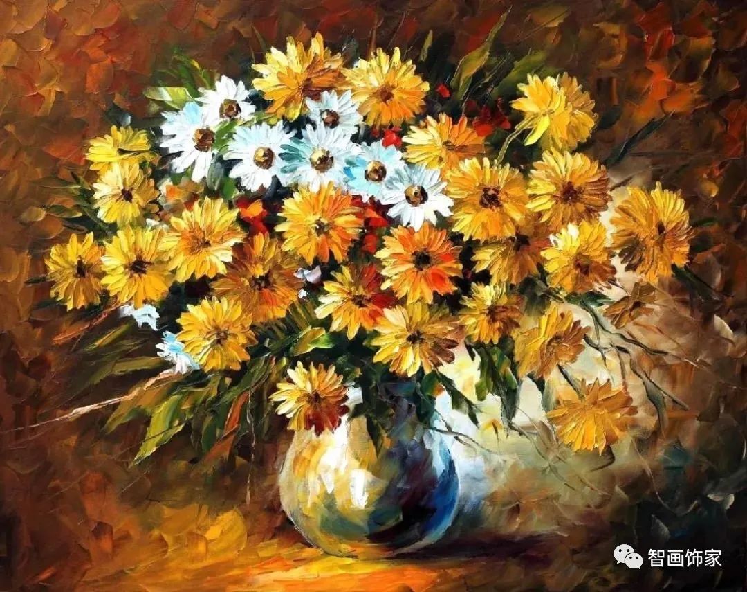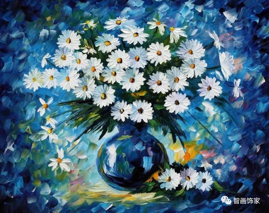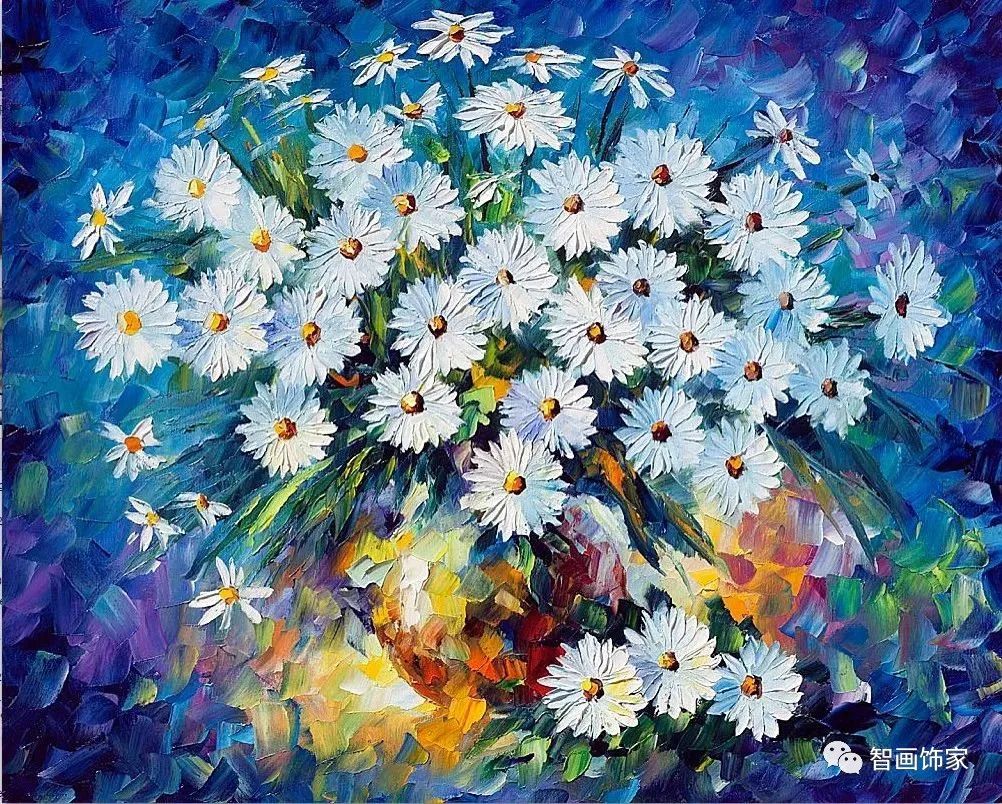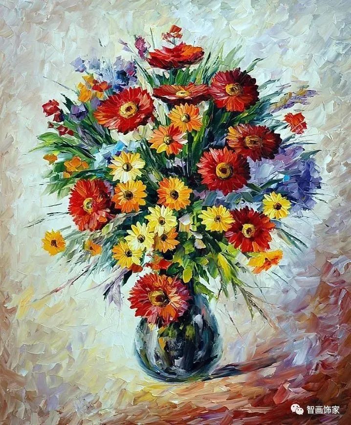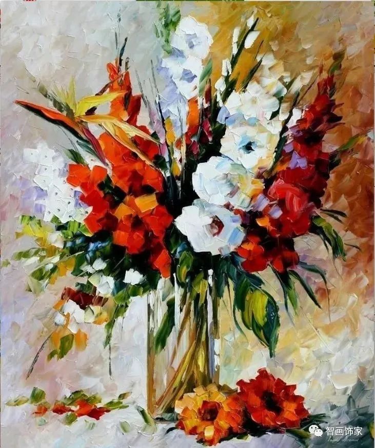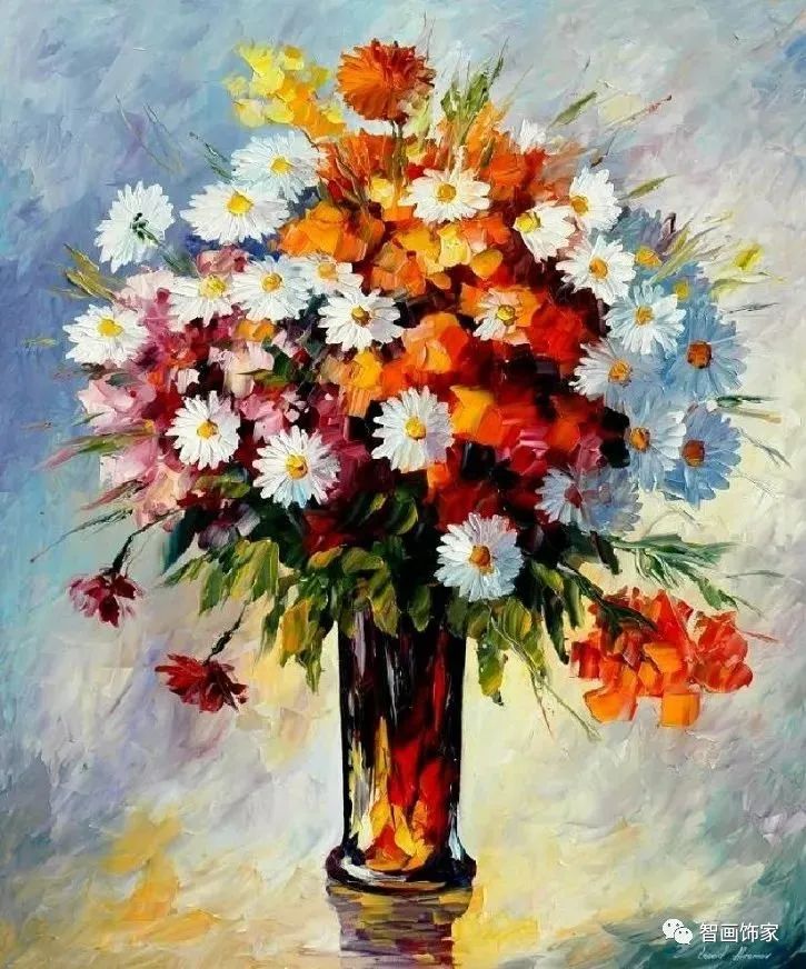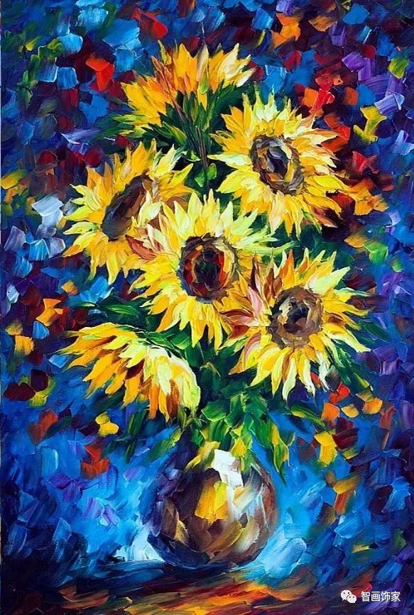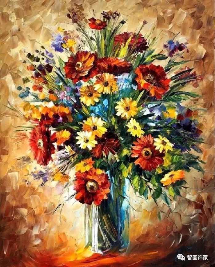 Leonid Afremov, 出生于白俄罗斯维捷布斯克市,是当代著名的现代印象派艺术家。其作品主要用调色刀与天然油料的搭配在画布上作画。以刀作画,他的绘画技巧、色彩上的层次运用纯熟浑厚, 令人惊叹。见过他不少风景,今天带来的是他笔下的静物花卉,看它们是如何绽放的。
