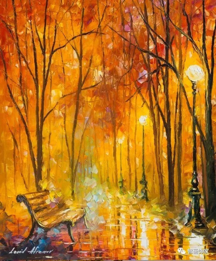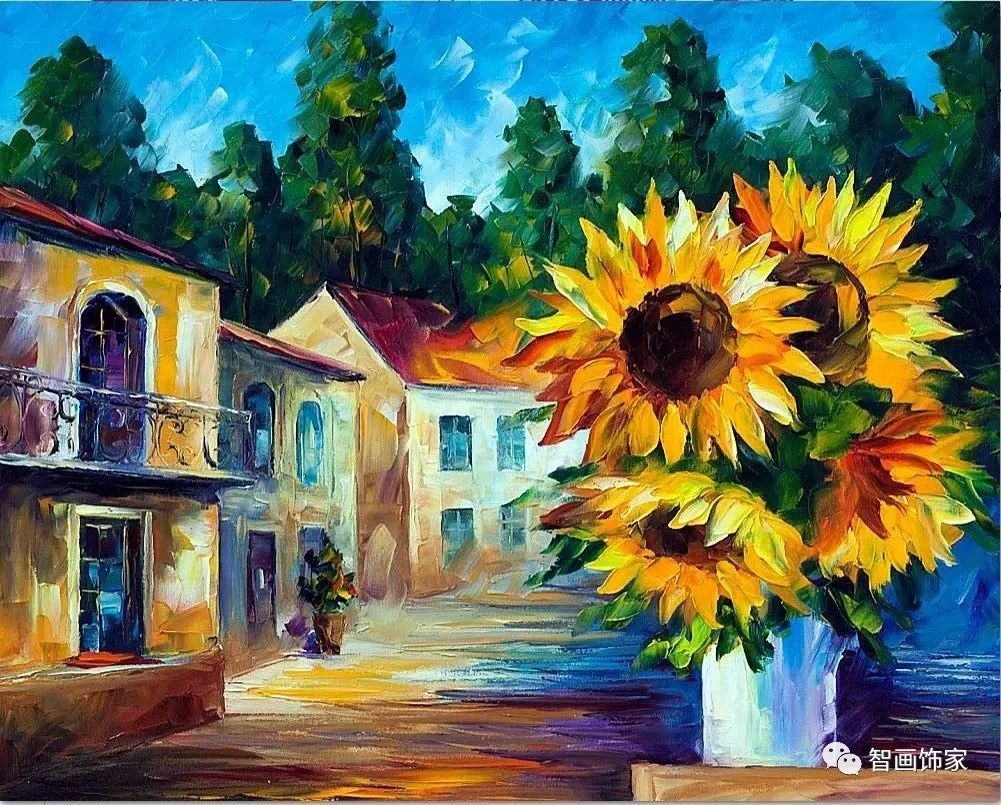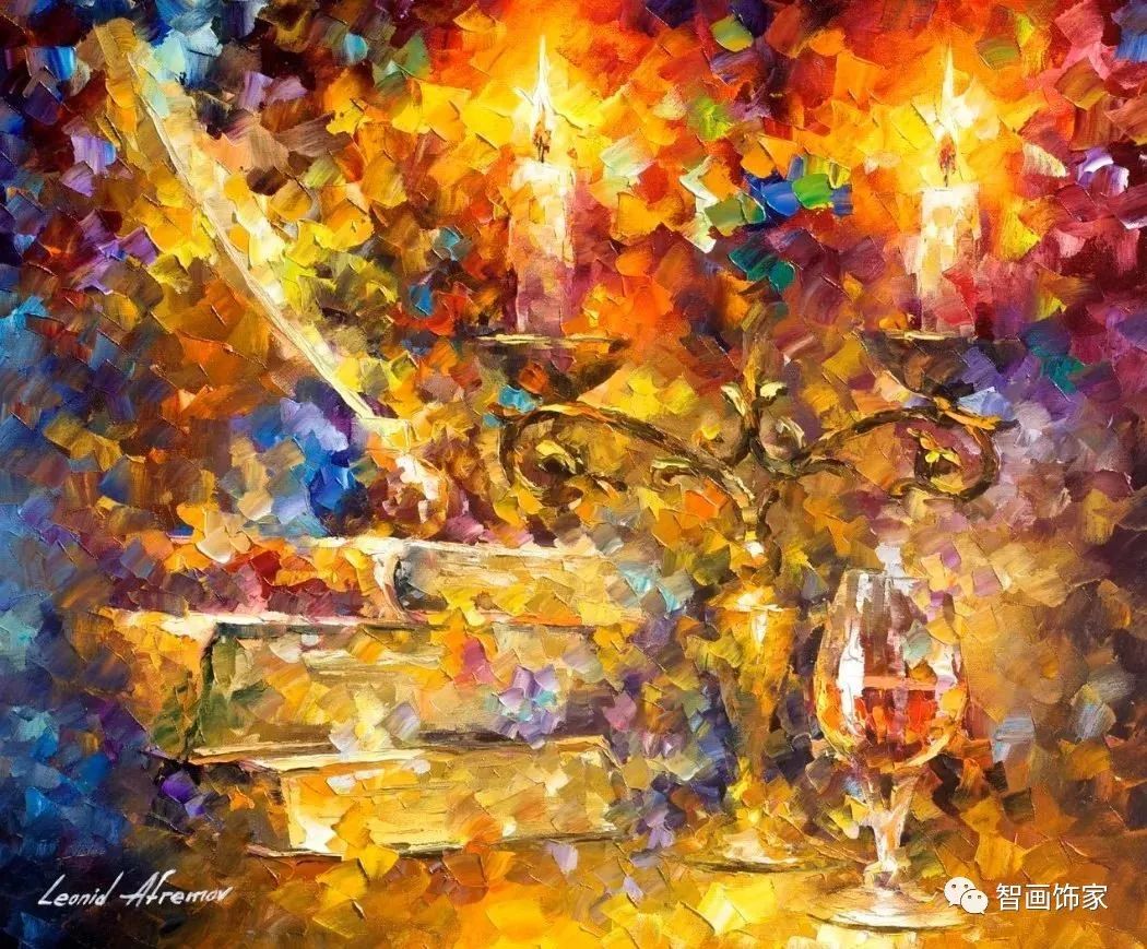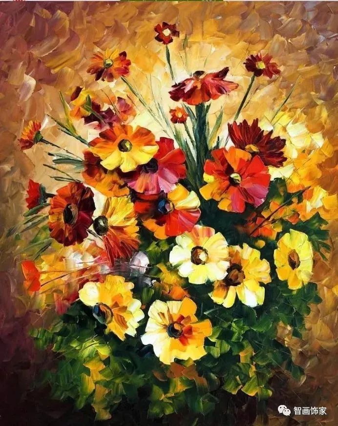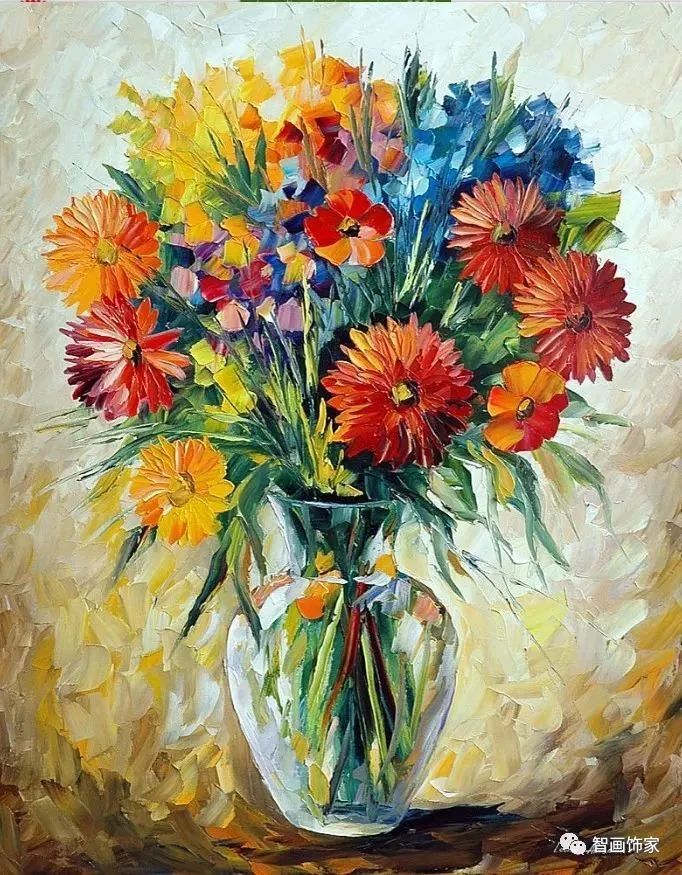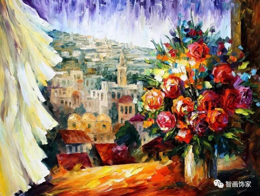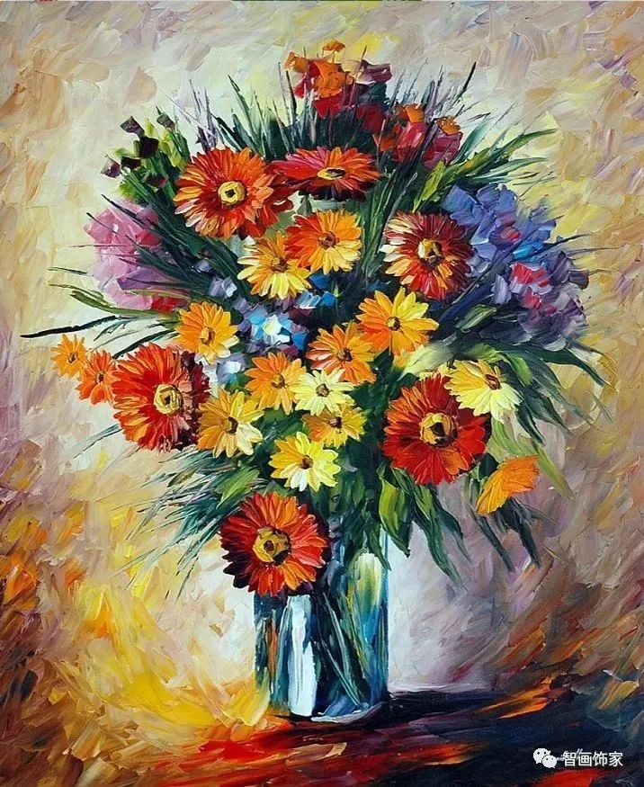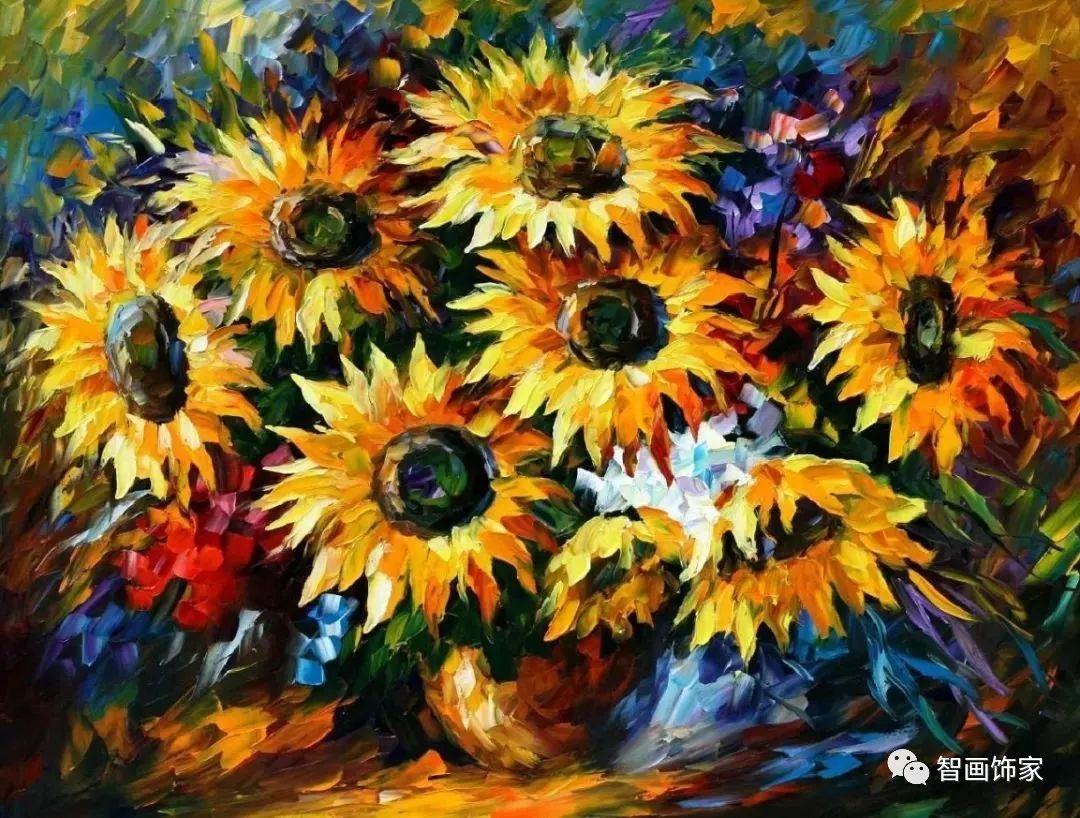 Leonid Afremov, 出生于白俄罗斯维捷布斯克市,是当代著名的现代印象派艺术家。其作品主要用调色刀与天然油料的搭配在画布上作画。以刀作画,他的绘画技巧、色彩上的层次运用纯熟浑厚, 令人惊叹。见过他不少风景,今天带来的是他笔下的静物花卉,看它们是如何绽放的。